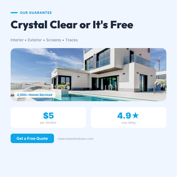 Crystal clear guarantee. 2,000+ homes cleaned. Interior, exterior, screens, and tracks. Starting at $5/window.